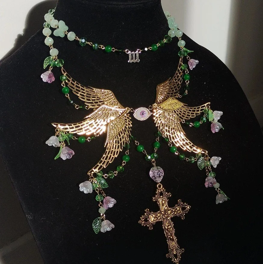A beautiful necklace adorned with lampwork beads, hearts and a green fox pendant. Perfect for yourself or the whimsical fairy in your life.